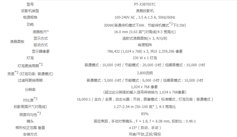 产品名称 : 投影仪型号 : PT-X3870STC 品牌 : 松下