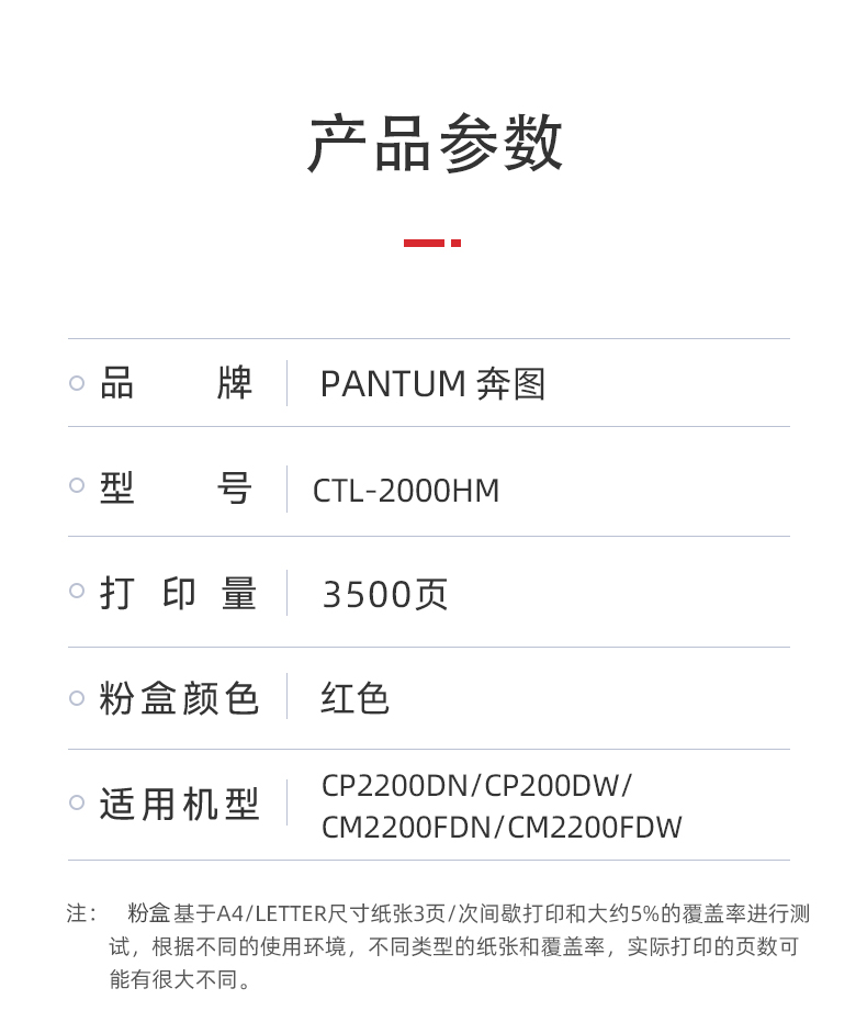 • 商品名称:奔图(PANTUM)CTL-2000HM红色粉盒 适用CP2200DW CM2200FDW CP2200DN CM2200FDN打印机